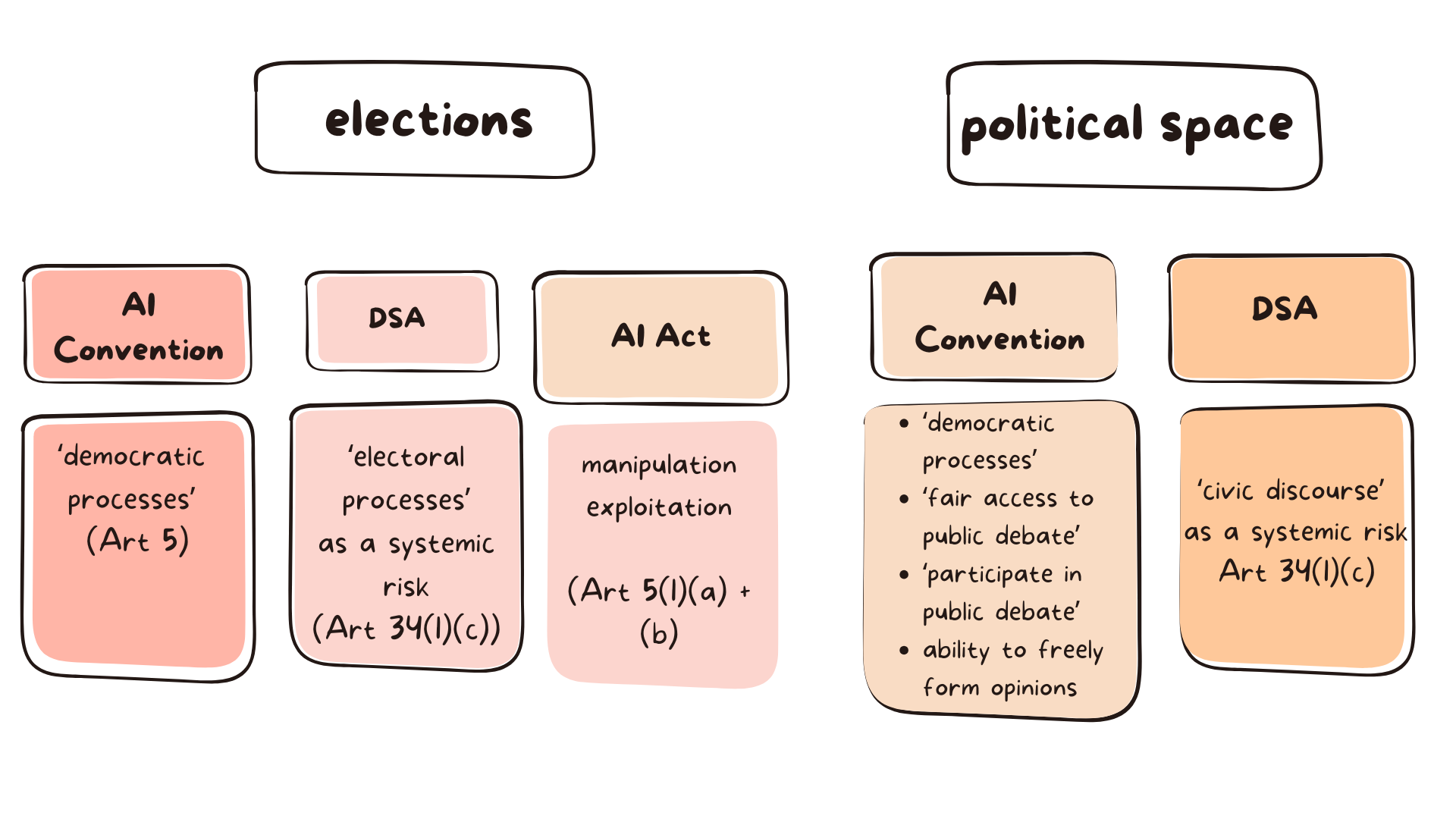 Recent pieces of legislation introduce and protect new regulatory categories/interests, including ‘democratic processes’ and ‘individuals’ fair access to and participation in public debate’, under the Framework AI Convention (7.4.1); or ‘electoral processes’ and ‘civic discourse’, under the DSA (7.4.2). Potential manipulation or exploitation of human vulnerabilities can also be relevant under Article 5(1)(a), (b) EU AI Act (7.4.3) (for prohibited AI practices see discussion in 4.4))